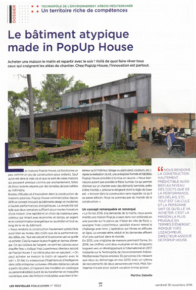 PopUp House compared to “a construction game” for its quick process : discover the article published November 2016 in Les Nouvelles publications.